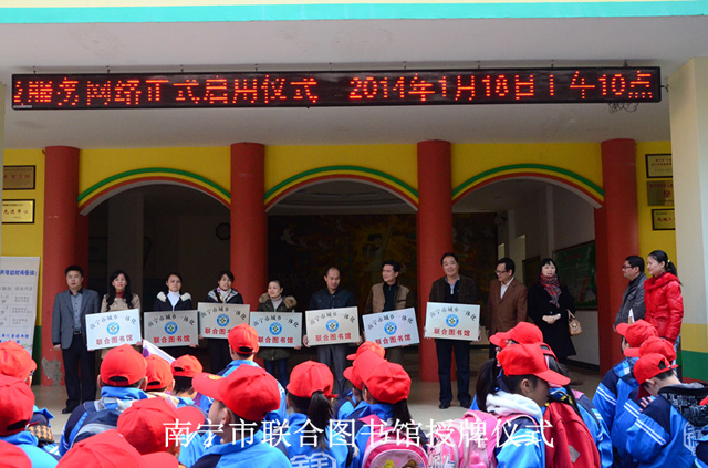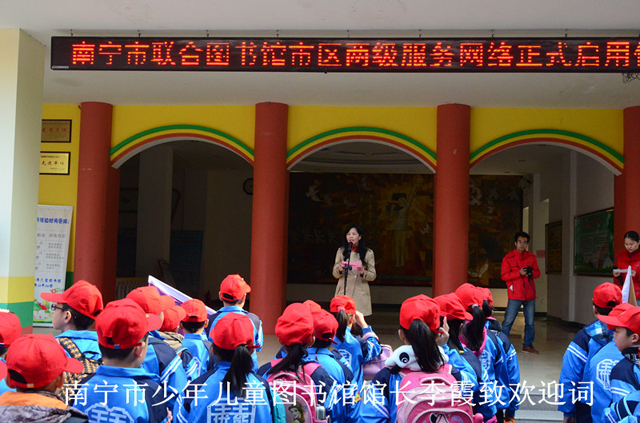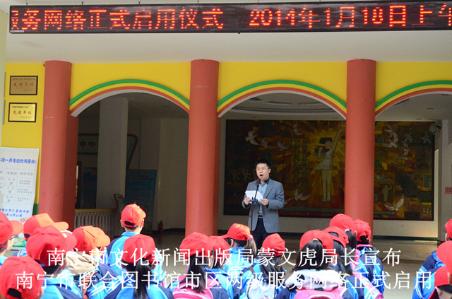 2014年1月18日上午10时,“书香南宁·同城便利”南宁市城乡一体化联合图书馆市、区二级服务网络正式启用仪式在南宁市少年儿童图书馆举行。南宁市文化新闻出版局局长蒙文虎、纪检组长李德山、公共文化科科长谢榭、市图书馆馆长贺南潮、市少年儿童图书馆馆长李霞,以及城区图书馆馆长和市级两馆相关工作人员出席了仪式。