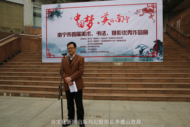 为展示“美丽南宁·清洁乡村”和“美丽南宁·整洁畅通有序大行动”民生工程之成果,展现美丽南宁的新面貌,南宁市“美丽南宁·清洁乡村”活动领导小组办公室、南宁市“美丽南宁·整洁畅通有序大行动”指挥部办公室与南宁市文化新闻出版局共同举办了本次展览,并交给南宁市群众艺术馆与南宁市图书馆承办。在27日上午举行的开幕式上,南宁市文化新闻出版局党组成员、纪检组长李德山致辞并宣布开幕。南宁市书法家协会主席黄大业、副主席黄卫保、市美术家协会画家刘明信等书画名家在展览现场挥毫泼墨为到场群众送上寄托着新年美好寓意的书画作品。