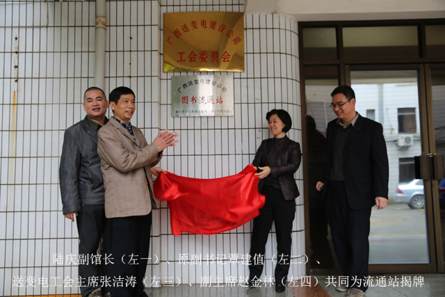 3月25日,南宁市图书馆汽车图书馆流通服务部邵高宁主任、读者活动部全维明主任等一行在陆庆副馆长的带领下到广西送变电建设公司举行了图书流通站揭牌仪式。