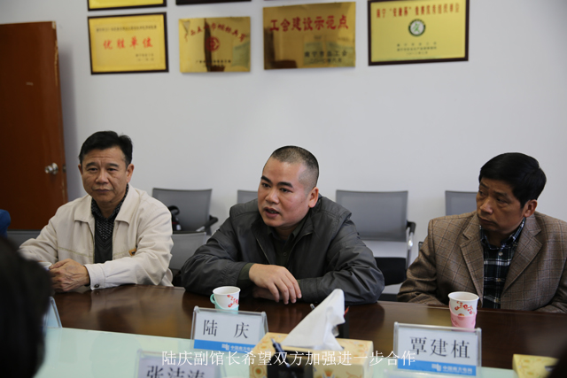 当天,南宁市图书馆陆庆副馆长、原支部副书记覃建值、广西送变电建设公司工会主席张洁涛、副主席赵金林共同为流通站揭牌。双方单位还举行了座谈会,就今后进一步深入的交流与合作展开了友好的会谈。张洁涛主席谈到广西送变电建设公司职工数量庞大,公司也非常重视企业文化建设,平时的职工文化活动开展得丰富多彩,工会还组织了读书沙龙供阅读爱好者交流。图书流通站成立后,工会也通过多种渠道向职工宣传,以提高图书借阅率及阅览室利用率,下一步还将为流通站配备三台电脑,录入电子书目方便读者查询借阅。了解了该公司的积极合作意向,南宁市图书馆陆庆副馆长也提出了合作建议,拟将该流通站纳入“南宁市城乡一体化联合图书馆”分馆,与南宁市图书馆中心馆使用统一的集群管理平台Interlib,对流通站实行数字化管理,还可以共享联合图书馆的书目数据、电子图书,实行通借通还等。此外,读者活动部也与工会商讨了联合开展公益文化讲座、职工文体活动等事宜。双方都对下一步的合作抱持极高的期待,有信心将该图书流通站建设成为职工家门口的书房,有效促进企业文化及全民阅读的开展。