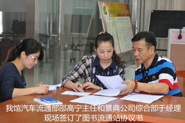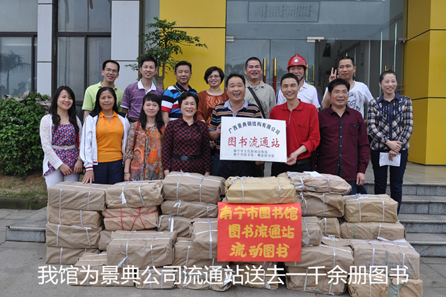 为充分利用好图书馆的文化资源,深化发展图书馆服务外延,以公共文化助力企业文化建设,4月10日,南宁市图书馆广西景典钢结构有限公司图书流通站挂牌成立。我馆馆长贺南潮、副馆长陆庆率工作人员一行9人送去首批图书一千余册,横县图书馆作为流通站共建单位,也送去图书五百册,为企业职工带去了丰富的精神食粮。当天上午,流通站挂牌仪式在景典公司位于南宁市六景工业园区的生产基地内举行,我馆馆长贺南潮、横县图书馆馆长黄晓冬、景典公司董事长、总经理李典和公司副总经理甘书明共同为图书流通站揭牌。我馆汽车流通部邵高宁主任和景典公司综合部于经理现场签订了图书流通站协议书。