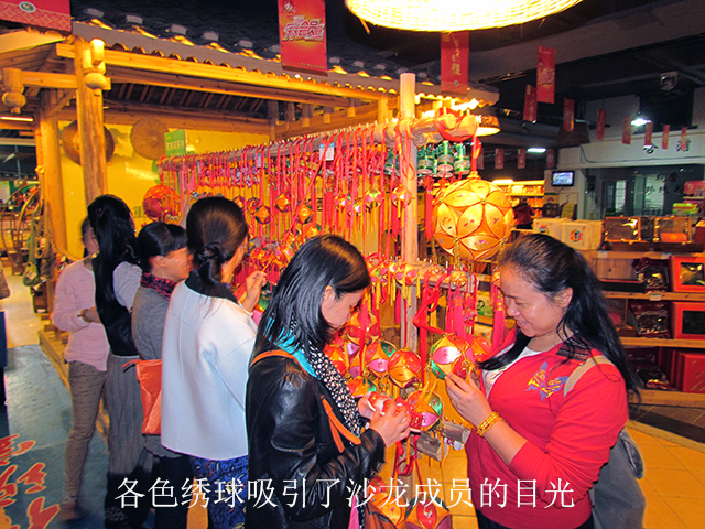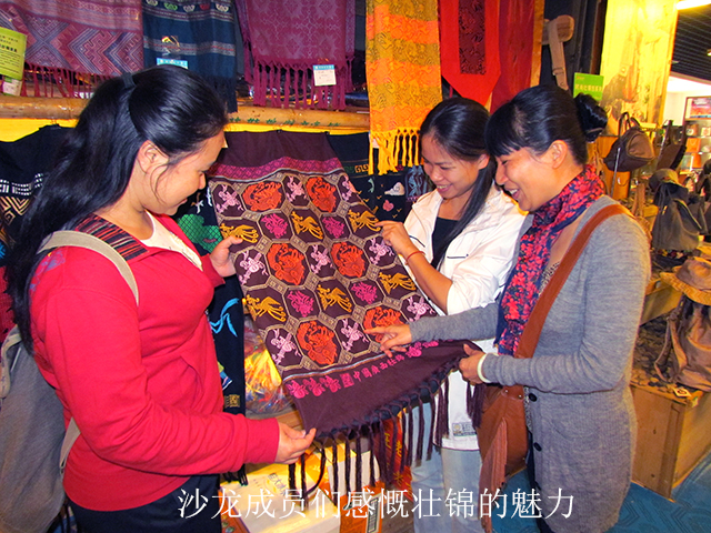 随后,沙龙成员们在雨后的清爽中开始追寻壮文化的足迹,大家一起来到坊内一处集中陈列壮锦、绣球等壮文化特色工艺品的展厅,看着色彩斑斓、手工了得的这些工艺品,沙龙成员们触摸欣赏间不禁感慨万千,打心底里佩服壮族人民的心灵手巧。