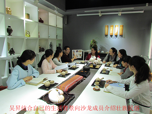 活动当天虽然突降大雨,但丝毫不影响沙龙成员们的情绪,反而籍着雨势更加热情高涨。大家在坊内的万仟堂文化中心以“读书了解壮文化”为活动契机,拉开了一天活动的序幕——彩色摄影画册《壮族》首先成为沙龙成员们的焦点学习读物,通过同读共享绿水青山笑颜开、民俗风情多姿彩、传统壮医美名扬等9个章节的内容,大家看到了壮族人民高尚的生活情趣和坚定自信的民族意识;沙龙成员们还试唱了《壮族山歌集》一书中收录的几首山歌,颇具壮族山歌地方特色的曲调回旋在雨中的长廊,吸引了不少路人驻足聆听,令其中几位壮族的沙龙成员更坚定了自己的民族自豪感和自信心;《广西民俗》和《壮族民俗风情》两书包含了欢乐的劳动场景、瑰丽的生活画面、缤纷的岁时节日、庄重的民族礼仪、愉悦的游艺民俗、动人的民族观念、璀璨的民族艺术以及丰富的民间文学等,前来参加沙龙活动的壮族人吴昇以自己的亲眼所见和亲身经历向大家生动地讲述了广西世居民族经典独特的风土人情,令听者收获颇丰。