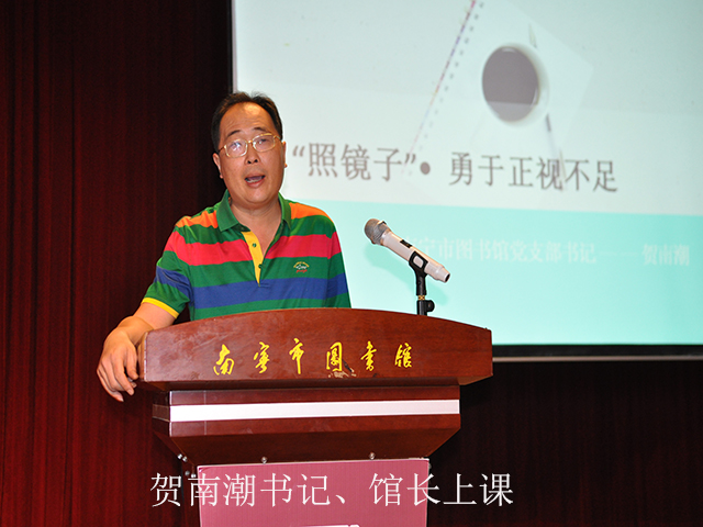 就如何做到“照镜子,找不足”,贺南潮馆长以我馆读者活动部、物业部、邵高宁、陈啸秋等几位同志为例,号召大家向有责任心的同志学习,并提出干部队伍、党员队伍必须要有责任意识、团队意识、创新意识。责任意识,就是要求大家在各自的部门勇挑重任,有担当,有作为;团队意识,就是大家自己耕耘好自己的一亩三分地的同时,学会理解其他部门的工作,必要的时候给予支持和帮助,进一步来说:就是我们单位任何一位员工都要熟悉不同部门、不同岗位的工作性质,随时可以进行部门岗位的轮岗,或者说,在关键时刻,任何一位员工都可以胜任任何部门的岗位,及时给读者服务;创新意识,就是希望大家带头与时俱进,积极学习和掌握新的服务理念、服务方式和服务手段——从小说起,就是希望我们的员工在自己的部门、自己的工作岗位做起,针对部门的实际工作,提出合理化建议,用先进的服务理念去为读者服务;从大处来说,就是针对我们馆存在的不足,大家献计献策,找出存在的问题,向先进的同行学习,学习他们先进的服务理念、服务方式和服务手段,改变我们馆落后的状态。