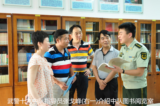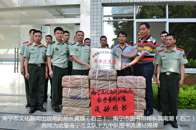 图书连起同心结,共谱鱼水新篇章。5月21日下午,南宁市图书馆“武警南宁市支队十九中队图书流通站”在武警十九中队驻地揭牌。南宁市文化新闻出版局副局长黄焕、南宁市图书馆馆长贺南潮等领导一行10人为武警官兵带去丰富的精神食粮。