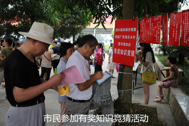 当天的主题活动内容丰富,形式多样,包括各公共图书馆的馆况介绍、服务宣传板报;现场解答读者咨询;精选优秀书目展阅;科技、卫生、保健知识资料发放;电影免费放映和有奖知识问答等。特别值得一提的是,南宁市图书馆专门制作了“世界体操锦标赛知识”和“美丽广西•清洁乡村知识”等知识问答题目,为即将在南宁市举办的第四十五届世界体操锦标赛和正在广西深入开展的“美丽广西•清洁乡村”活动这两件大事积极宣传,这样接地气、聚人气、树正气的活动深受广大市民的欢迎。丰富多彩的图书馆服务宣传周活动吸引了社会各界的广泛参与,对广大市民认识图书馆、走进图书馆、利用图书馆、增强图书馆意识起到了积极的作用,有利于激发全民的阅读兴趣,使广大市民特别是青少年、进城务工人员等群体进一步了解公共图书馆免费开放的内容,能够充分利用公共图书馆的资源,从而进一步提升图书馆公共文化服务能力,推动学习型社会向前迈进。