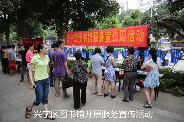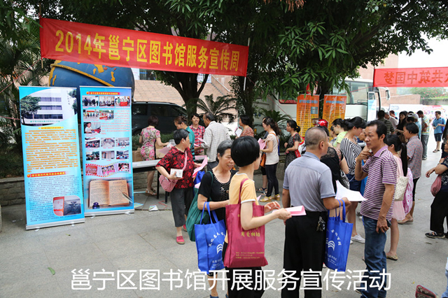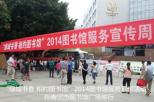 为进一步贯彻落实党的十八大会议精神,践行党的群众路线教育实践活动,推动社会主义文化的大发展大繁荣,丰富广大市民的文化生活,引导市民多读书,读好书,营造良好的读书氛围,5月28日上午,“绿城书香•相约图书馆”2014图书馆服务宣传周主题活动在南宁市图书馆广场举行。本次活动由南宁市图书馆学会主办,参与活动的图书馆包括南宁市图书馆和南宁市六城区图书馆(兴宁区、江南区、青秀区、西乡塘区、邕宁区、良庆区)共7家公共图书馆。