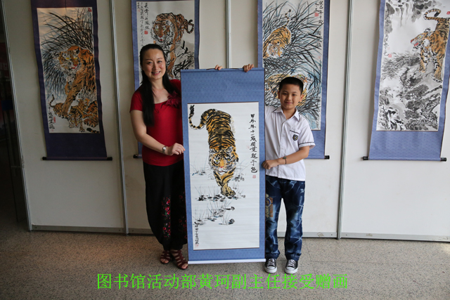 在画展开幕式上,麦栢荣现场作画引来不少读者驻足欣赏,当他盖上自己刻制的篆刻印章后,诚挚地将这幅神采飞扬的“虎虎生威”赠送给南宁市图书馆永久收藏。南宁市文化新闻出版局黄焕副局长在开幕式后参观了该展,并对画展进行了高度评价,赞扬了麦栢荣的作画精神,希望这位崭露头角的小画家能代表南宁市参加下半年东盟儿童艺术汇展活动。