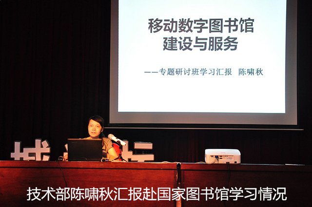 随后,技术部陈啸秋老师代表5月中赴北京参加中国图书馆学会在国家图书馆举办的“移动数字图书馆建设与服务专题研讨班”学习组汇报了学习情况。她分享了国家图书馆、上海图书馆、清华大学和北京大学图书馆在图书馆移动服务等方面的成功做法和经验,介绍了各馆在移动技术与图书馆服务的融合上做出的探索和实践,展示了各馆的移动服务平台,并从读者对图书馆移动服务的需求展开分析,提出了先进地区经验对我馆开展手机图书馆项目建设工作的启示。她提出,在当前大数据服务背景下,随着移动通信技术、移动互联网的快速发展,移动数字阅读日益普及,移动服务成为图书馆整体服务体系中的有机组成部分。移动服务为读者利用馆藏文献信息资源提供了极大的便捷,同时也给图书馆带来了前所未有的发展机遇。如何开展好图书馆的移动服务,创新图书馆的服务模式,以扩大图书馆的服务范围,提升图书馆的服务效率和能力,真正方便读者和服务社会,是我们下一步工作需要认真研究和实践的一个重点。