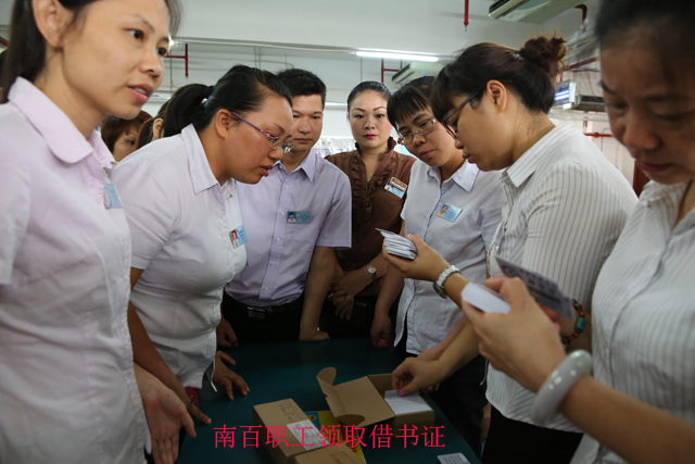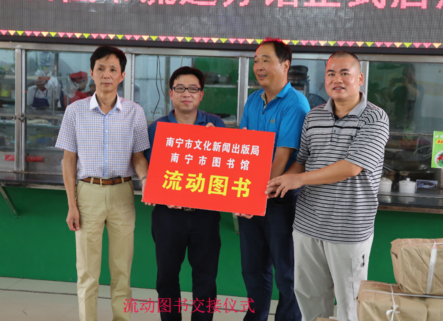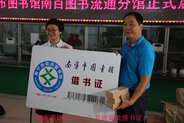 南宁市文化新闻出版局黄焕副局长与该局公共文化科雷鸣副科长为南宁百货大楼股份有限公司图书流通分馆共同授牌,南宁市图书馆贺南潮馆长和陆庆副馆长为该分馆配送图书1500册,贺南潮馆长还在现场发放了首批借书证1200份,今后还将根据阅读需求陆续增加借书证的发放数量,极大程度地方便广大市民到该分馆阅读图书。