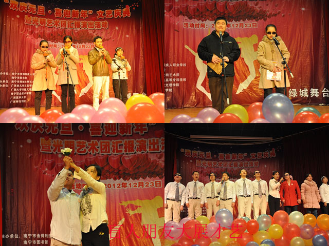 二是大力盲人阅读推广工作。围绕世界读书日、国际盲人节、全国助残日、残疾人服务周、“书香绿城”读书周等节日主题,与南宁市残疾人联合会、南宁市南国之光残疾人艺术团、南宁点亮文化传播有限公司等单位、团体合作,积极开展以“残疾人阅览室服务”为中心、盲人文化活动为支持的阅读推广活动,充分展示盲人群体健康向上的精神风貌,让盲人朋友感受到社会各界的理解和关爱,使图书馆成为盲人读者的精神家园。