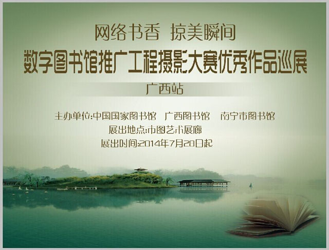 为展现数字图书馆推广工程的服务成效,倡导大众阅读,国家图书馆和中国图书馆学会于2014年2月联合推出了“网络书香•掠美瞬间”数字图书馆推广工程摄影大赛,经过组委会特邀专家的精心遴选,分别评出了专业组和大众组的获奖作品,同时推荐200幅作品入围本次展览。从7月28日起,本次摄影大赛优秀作品巡展广西站亮相南宁市图书馆艺术展廊。