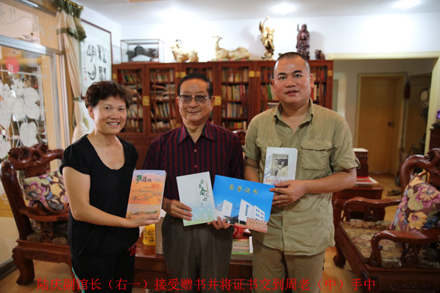 8月19日,在原南宁市文化新闻出版局局长陈晓玲女士的热心牵线下,南宁市图书馆陆庆副馆长等一行来到原中共南宁市委副书记,自治区总工会主席、党组书记周民霖家中,接受周老先生创作或参与主编的《春去春又回》《飘逸的脚步》等多册散文集以及《中国冬泳史料选编》等珍贵的地方史料书籍的捐赠。