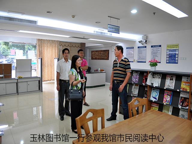 玉林市图书馆一行还对我馆装修一新的市民阅读中心啧啧称赞。重新装修后的市民阅读中心比之前更舒适、更宽敞、更明亮。开放式的报刊架既有效区隔了阅读区域,又方便了读者取阅,同时也与阅览桌椅、墙上字画交相辉映,给读者以大书房般的温馨体验。