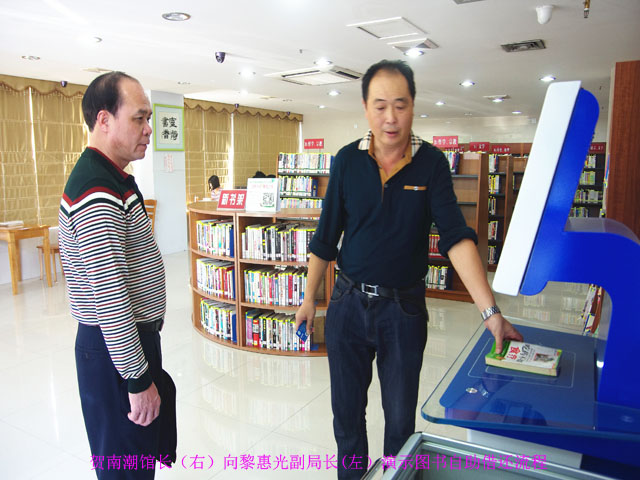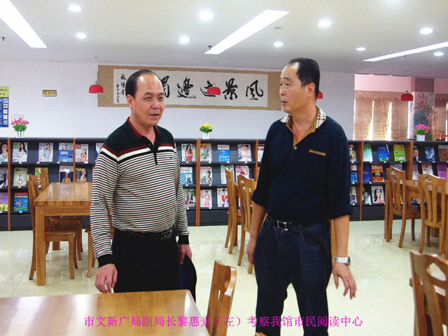随后,黎副局长一行实地走访南宁市图书馆市民阅读中心和24小时自助图书馆。贺南潮馆长向局领导汇报了我馆免费开放的服务情况,并重点介绍了进一步推广社区24小时自助图书馆的思路与想法。黎副局长表示将支持落实社区图书馆这一文化惠民的项目,同时希望图书馆在读者活动方面进一步加强与系统内多个服务单位的交流与合作,深入基层、深入百姓,打造具有高度影响力的服务品牌和服务亮点,不断提升社会公共文化服务的内涵和外延,努力推进全市文化建设迈上新台阶。