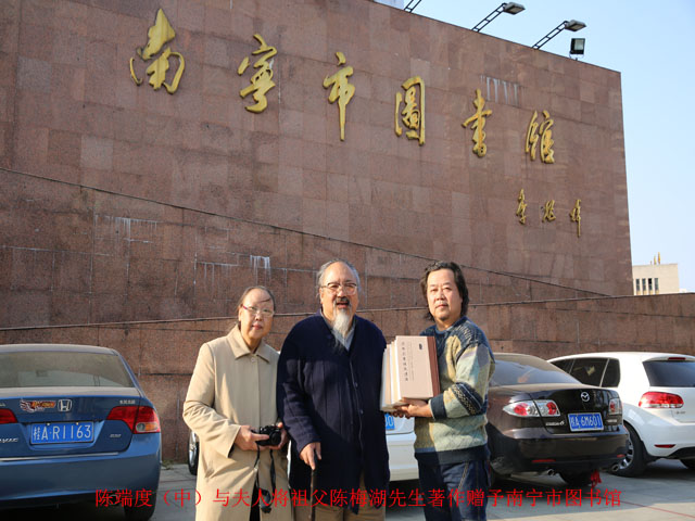 12月12日,来自山西的陈端度先生驱车两千多公里抵达南宁,向南宁市图书馆捐赠其祖父陈梅湖所著《南澳县志》、《陈公梅湖文献选》十五种中的四种:《岭东道•惠潮嘉道职官志 韩公愈治潮州事迹》、《粤闽南澳职官志》、《浙江诸暨嵝岣张氏家谱及浙粤逸史》、《隆都大巷陈氏族谱》各一册及陈潘仪纂修的《广东省大埔县百侯曹碓背甜竹陈氏颍川郡崇庆堂裕庆堂族谱》一册。