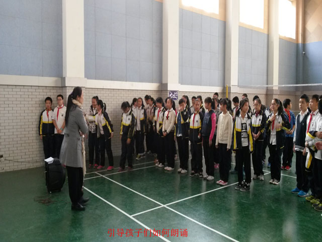 黄珂告诉孩子们,古诗词朗诵首先要咬字清晰,即普通话一定要发音准确,尤其是舞台表演,抑扬顿挫务必有节有律,她以孩子们即将上台表演的《满江红》为例,引导大家调整气息,为孩子们张罗队形排列和注意事项的申继清老师也在现场一同进行指导。黄珂在聆听了孩子们的朗诵后展开点评,她肯定了孩子们认真的态度和标准的读音,并给大家播放作为朗诵背景音乐的《精忠报国》,令孩子们为之一振——伴着音乐有力的节奏,有的做骑马打仗状,有的做英勇救国状;而后她在感情酝酿方面为孩子们做了详细的指导——朗诵与唱歌有着相似之处,要满怀激情,在呼吸中做到深吸慢吐,尽量避免字字连读,而是要做到一字一句字正腔圆,她说:《满江红》是一首气壮山河、光照日月的传世名作,岳飞是南宋抗金名将,他多次与金兵作战,屡战屡胜,但由于朝廷昏庸,秦桧等奸臣当道,致使岳家军当时既无援兵又无粮草,导致不得不撤回。岳飞情郁其中,独上高楼,栏杆拍遍,仰天长啸,写下了这首感人肺腑的千古绝唱——《满江红》,所以,要想朗诵好这首诗词,就必须了解它的历史背景,同时掌握朗诵的技巧,使整个朗诵成为一种享受。她还以古代诗和现代诗等或柔情或铿锵的朗诵风格做对比,来反衬《满江红》的义愤填膺。随后,黄珂在要求孩子们台风风貌的同时强调:两眼有神、表情刚毅非常重要,舞台表演时的出场退场要始终如一,她为孩子们设计了几个简单且振奋的舞台动作以充实舞台效果,如“抬望眼,仰天长啸,壮怀激烈”处做摆臂握拳的动作,分三层进行,“莫等闲、白了少年头,空悲切”处亦根据队形分别做次第摊手无奈的动作,讲到“驾长车、踏破贺兰山缺”处,孩子们一边做举手驾车的动作一边发出欢快的笑声,“待从头、收拾旧山河,朝天阙”是高潮部分,所以此处左、中、右队列共同的手臂上举动作会丰满整个舞台的画面感,作为亮相来结束表演。