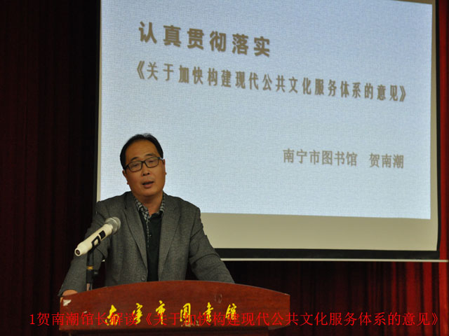 最后,贺南潮馆长向大家解读了中共中央办公室、国务院办公厅日前印发的《关于加快构建现代公共文化服务体系的意见》,并围绕《广西壮族自治区构建现代公共文化服务体系工作方案》提出的到2020年广西基本建成现代公共文化服务体系的总体目标,立足图书馆建设实际,就我馆贯彻落实《意见》工作进行安排部署。一是要进一步认真解读《意见》,深刻领会政策,结合政策提供的大好机遇,推动图书馆新馆建设等事业发展;二是要制定和落实《南宁市图书馆“十三五”发展规划》,明确未来五年的工作重点,提出一些重大项目和重要举措,制定、策划和实施一批重大文化惠民工程,分阶段、按步骤推动“深夜书房”、“书香地铁”、“城乡一体化联合图书馆”、“泛北部湾图书馆联盟”等项目的建设,力争公共文化服务体系建设实现跨越式发展;三是要深化改革,实行全员上岗培训、部门人员局部轮岗、中层竞聘上岗、中层挑选员工的模式,实现岗位需要与人才资源的良好互动,,推动人才队伍的建设和发展。