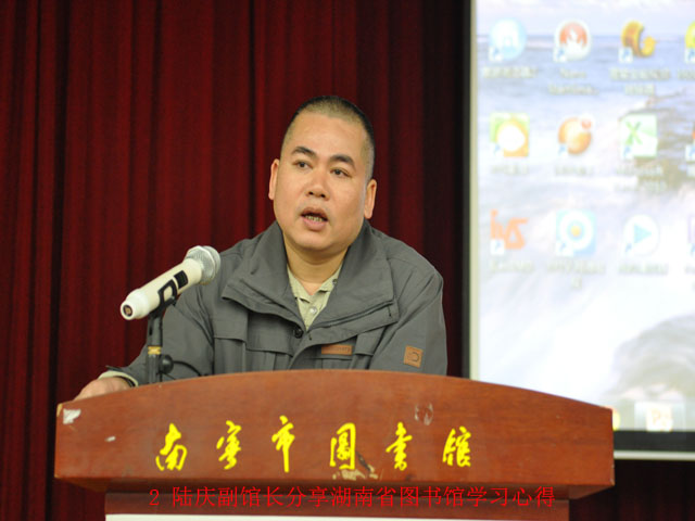会议首先听取了陆庆副馆长的学习报告。在报告中,陆庆副馆长通过分享湖南省图书馆在开展参考咨询服务、特色数字资源建设、人事管理等方面的经验做法,使广大干部接受了新的理念、开拓了视野胸襟、提高了思维层次、推动了思想解放,同时也为图书馆今后的工作开展提供了有益的借鉴。