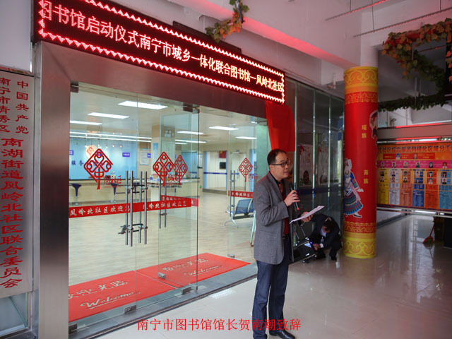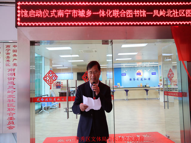 南宁市文化新闻出版广电局副局长黎惠光、南宁市文化新闻出版广电局公共文化科科长谢榭、南宁市图书馆馆长贺南潮、青秀区文体局局长潘立凡、青秀区街道办的领导以及南宁市图书馆工作人员、广大社区居民近百人参加了当天的启动仪式。南宁市图书馆馆长贺南潮代表南宁市图书馆学会做了讲话。他指出,凤岭北社区图书馆分馆是“南宁市城乡一体化联合图书馆项目”实现的首家社区分馆,它的正式启动,标志着联合图书馆服务体系正式向第三层服务网络迈进,不仅有助于实现普遍均等的公共文化服务,并将对保障市民的基本文化权益、丰富市民的精神文化生活、展示首府南宁的文化形象、提升南宁的城市品位、推进南宁的公共文化建设产生重大而深远的意义。