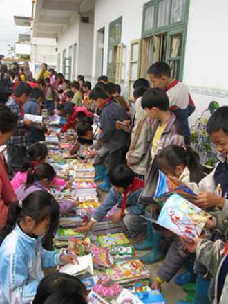 施厚村小学原来只有一间以教室隔出来的图书室,里面只有一个书架的书,大部分也已经陈旧,学生们渴望得到更多的课外读物。我馆通过南宁市电视台帮得行动, 有关节目得悉此事后,立即捐出了7百多册馆藏的热门少儿期刊。当天的活动,我馆与南宁电视台帮得行动栏目组以及另一家捐赠单位将近千册少儿读物送到学校,给施厚村小学的学生们带来了丰富的精神食粮。图书刚搬到教室门口,小学生们纷纷欢呼雀跃并热切地翻阅起来,眼里洋溢着对知识和对外界事物的渴望。