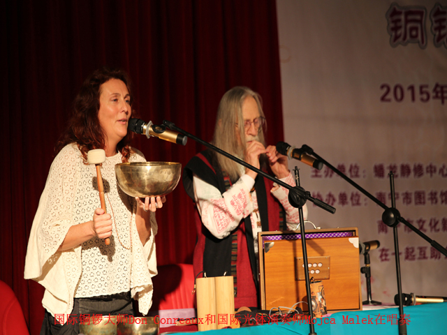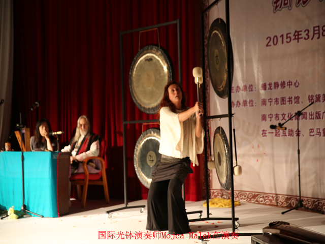 为弘扬中国传统文化,欢度“三•八”妇女节的到来,南宁市文化新闻出版广电局妇委会、南宁市图书馆、蟠龙静修文化中心、我在咖啡图书馆和在一起互助会等单位于3月8日晚上联合举办了精彩纷呈的铜锣音乐系列文化活动——“绿城讲坛”铜锣音乐赏析讲座和“绿城舞台”铜锣音乐会。“绿城讲坛”由全国专业人才教育委员会专家委员、国家心理咨询师丁逸主讲,“绿城舞台”由国际铜锣大师Don Conreaux和国际光钵演奏师Mojca Malek担纲演奏,400多人到场参加了活动。