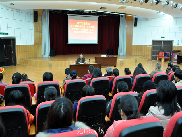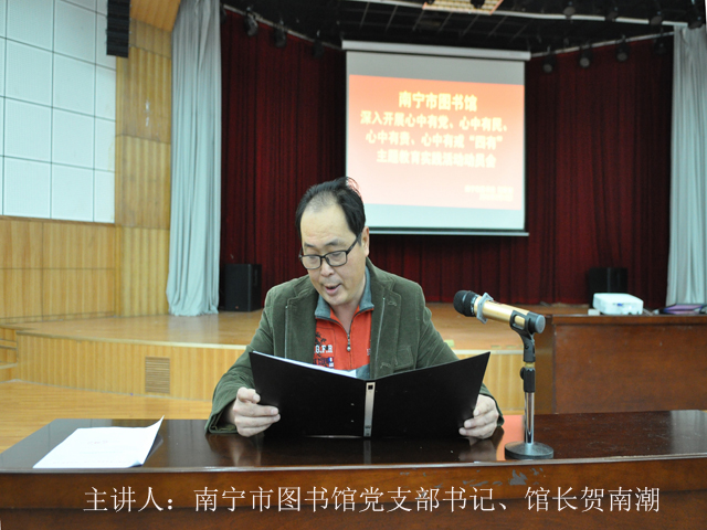 3月13日上午,,根据《中共南宁市委员会关于开展心中有党、心中有民、心中有责、心中有戒“四有”主题教育实践活动的决定》(南发﹝2015﹞6号)精神和《中共南宁市文化新闻出版广电局党组关于印发开展心中有党、心中有民、心中有责、心中有戒“四有”主题教育实践活动工作方案的通知》(南文新广党﹝2015﹞3号)的有关要求,南宁市图书馆举行心中有党、心中有民、心中有责、心中有戒“四有”主题实践活动。馆支部书记、馆长贺南潮以“四有”为主题,为全体党员、入党积极分子上了一堂党课。馆支部副书记廖集光主持当天的活动。