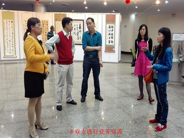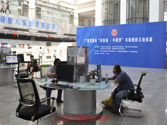 北海市图书馆新馆于1999年建成开馆,建筑面积18719平方米,现有各类文献26万册。走进焕然一新的一楼读者服务大厅,我们立刻被正在举办的“民族魂•中国梦”书画摄影巡展吸引,200余幅书画摄影作品为馆舍增添了文化艺术气息。大厅中央还放置了10台检索机、4台平板电脑和电子书借阅机,不少读者正在熟练的使用这些现代化电子设备。北海市图书馆党支部书记李道海对我馆一行的到来表示欢迎。在随后的座谈会中,双方领导和技术骨干就两市图书馆跨市联盟搭建“通借通还”平台前期工作展开交流,并就联盟平台系统设计及运用的对接、系统基本参数设置等具体细节进行了深入的探讨。北海馆表示,目前正在编制技术平台搭建方案,希望我馆能在技术业务上给予大力支持,继续加强合作,早日实现“通借通还”,促进广西北部湾区域城市之间图书文献的无障碍流转。