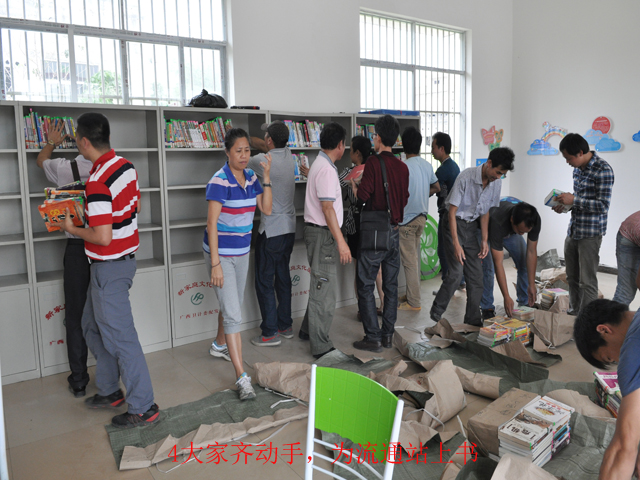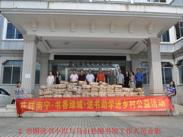 马山县周鹿填周水村地处马山县边远地区,虽然近两年建立了村级服务中心,但是文化资源仍然匮乏。为了让城乡居民享有同等文化权益 ,打破文化资源相对集中在城市的局面,真正做到文化惠民,南宁市图书馆精心挑选了近千册图书以及课桌、椅子等设备,并由贺南潮馆长率辅导部、读者活动部、汽车流通服务部、技术部等多部门的同志,前往该站送书,并就今后的工作开展调研和交流。