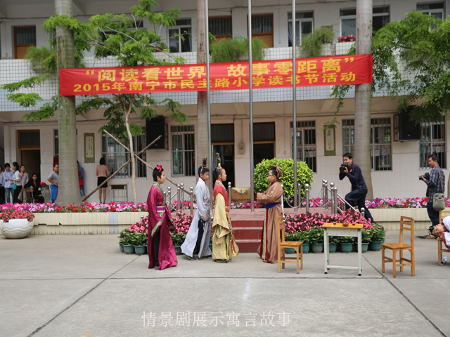 在当天的活动中,孩子们首先用故事情景剧、歌剧、话剧表演的方式分享在书籍中阅读到的故事及寓言。在童话故事人物展示秀中,记者看到一、二年级的孩子们盛装打扮,摇身变成白雪公主、孙悟空、小红帽、哈利波特、卖火柴的小女孩等一系列大家熟悉的故事人物;高年级的学生带来的《三顾茅庐》、《买椟还珠》、《滥竽充数》、《晏子使楚》等情景剧表演让观众掌声不断;话剧《壮族民俗“三月三”》更是通过“三月三”文化擂台赛来为壮族姑娘“招亲”,围绕节日民俗的提问让观众在观看中学习民俗知识。