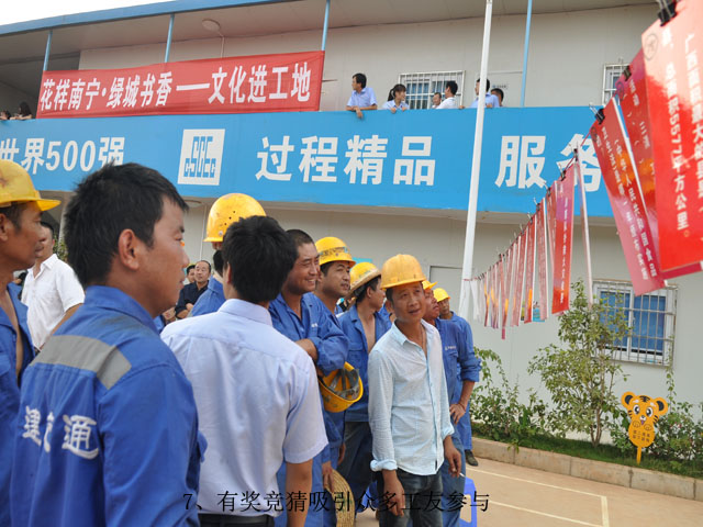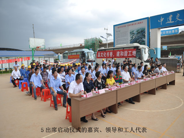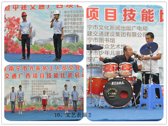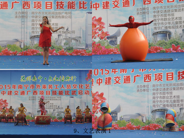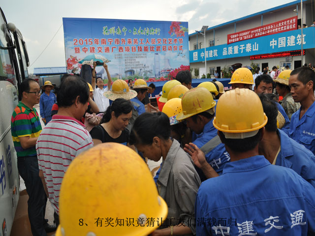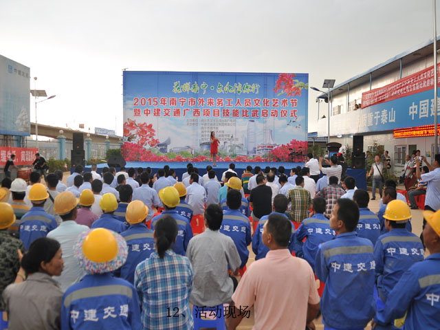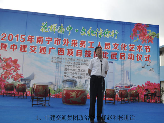 为深入贯彻落实党的十八大精神,加强和谐社会建设,活跃和繁荣进城务工人员的精神文化生活,保障进城务工人员的文化权益, 5月8日下午,2015年南宁市外来务工人员文化艺术节在平乐大道——玉洞大道立交工程建筑工地正式启动。南宁市文化新闻出版广电局副局长黎惠光、中建交通集团政治处主任赵利彬及各活动承办单位领导、中建交通广西分公司有关项目管理人员、农民工代表近300人参加了活动。