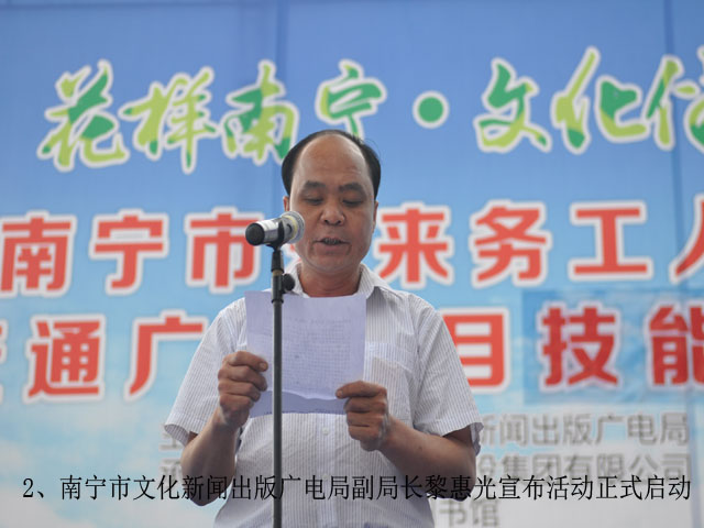 南宁市文化新闻出版广电局副局长黎惠光为本次艺术致辞并接受中建集团赠书。他说,艺术节的设立将送文艺和送文化有效地融合在一起,既让外来务工人员分享了我市的公共文化建设成果,又表现出我们南宁市兼容并蓄、多元素、接地气的文化氛围,希望以此为主题的系列活动长此以往,越办越好!
