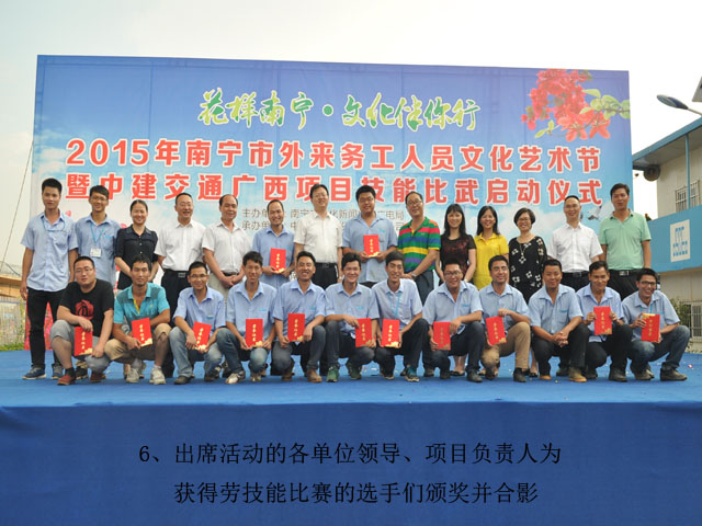 演出后,中建交通广西分公司还举办了务工人员技能比赛颁奖仪式,出席活动的领导为获奖选手颁奖。此次比赛充分展现了中建集团务工人员比学赶超、争创一流的良好精神风貌,激发了广大工人学知识、比技能的积极性,为建设文明、规范、安全、和谐工地奠定了良好的基础。