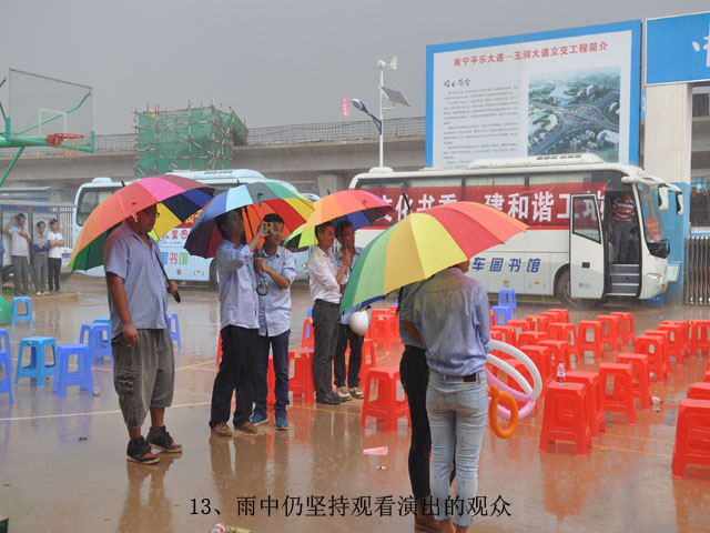 随后,一曲热情洋溢的花样鼓上舞拉开了本届“花样南宁•城市欢歌”文艺演出的序幕;国家一级演员、广西著名歌手陈春燕也亲临现场,献歌《花样南宁》,博得满堂彩;外来务工人员龙劲成、梁成出演的小品《安全与质量都重要》既务实又有深度,充分体现了建筑工作的艰辛与不易;徐琰、罗昕、赵阳阳、杜俊枚表演的合唱《see you again》精彩动听,赢得场上阵阵掌声;董付常自编自弹自唱的歌曲《坚强盾构人》唱出了盾构机工作者的责任与心声……蜘蛛侠气球秀、特技彩管舞特色节目都为现场观众带来了一场美妙绝伦的视听盛宴。尽管在文艺演出过程中一场大雨不期而至,但这没有浇灭本地文艺工作者和外来务工人员的热情。演员们坚持在舞台上表演,观众或转移到屋檐下,或撑着伞,继续津津有味地欣赏表演。