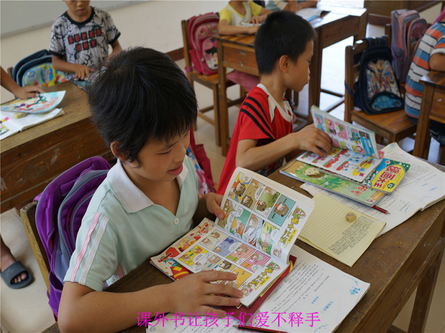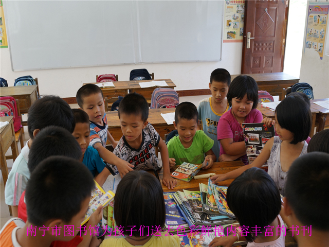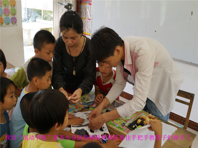 此次“爱心课堂”志愿服务活动,南宁市图书馆文化志愿服务小组一行组织开展了故事会、阅读课、手工课、文体活动等环节。其中,故事会由陈思佳老师主讲。他结合山里孩子的情况,为孩子们讲述寓言故事《会飞的小蜗牛》,以小蜗牛坚持努力,终于如愿飞到高处看到了广阔的世界的故事,勉励孩子们坚持梦想,为梦想而努力。陈老师生动活泼的讲课方式,令孩子们听得津津有味;在阅读课上,市图市馆为孩子们精心挑选并赠送了《创新作文》、《少年科学画报》、《漫画大王》、《中外童话故事》、《第一课堂》等54册适合入学儿童阅读的期刊,令孩子们如获至宝。只见孩子们拿到书本后便回到座位上翻阅起来,几十册图书不一会儿便一抢而空。大家看到精彩的内容还不忘与小伙伴们一起交流、分享,教室里顿时洋溢起浓浓书香。课后,孩子们还捧着书本拿回家与家人分享,小小阅读人变身阅读传播者,让我们深受感动;手工课上,科普杂志中的手工制作图片令山里的孩子们啧啧称赞。志愿服务小组的成员们齐上阵,手把手地与孩子们一起制作了纸折摩托车、赛车、万花筒等,充分调动了学生们的观察能力、想象力和动手能力,使他们在轻松愉快中学习了科技知识,享受了创造的乐趣,并感受到图书的魅力;文体活动课中,志愿服务小组的成员们与孩子们一起打羽毛球、乒乓球、跳绳。因为体育设备和场地有限,孩子们只能轮番上阵,一个个与老师“较量”,充分展示了学生们的团队精神和协作能力。师生们欢乐的笑声让宁静的山村沸腾了起来。