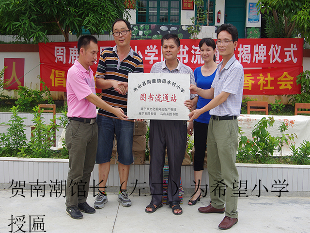 6月18日,南宁市文化新闻出版广电局、南宁市图书馆、马山县图书馆联合成立的马山周鹿镇周水天威希望小学图书流通站正式成立并开放。馆支部书记、馆长贺南潮率“流动书香”服务小组参加了当天的建站仪式,并为该校师生配送首批图书近800册,深受师生喜爱。