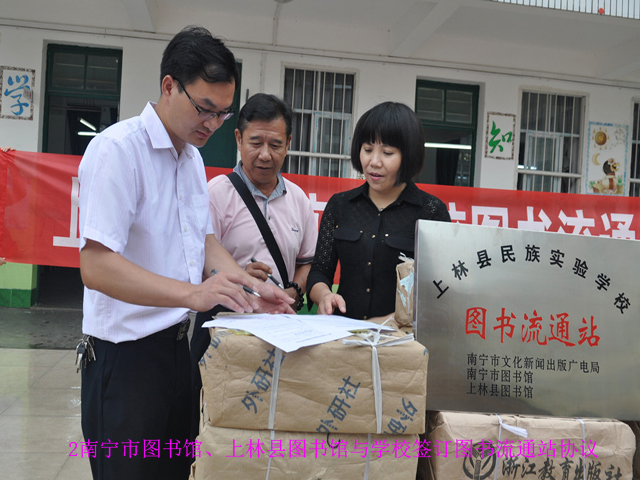6月25日上午,南宁市图书馆上林县民族实验学校图书流动站举行揭牌仪式,南宁市图书馆馆长贺南潮和上林县图书馆馆长陆大良率“党员先锋服务分队”为该校送去了精心挑选的1000余册各类图书,内容涉及教育、科普、文学、历史、百科知识等供学生们选读,受到了师生们的热烈欢迎。