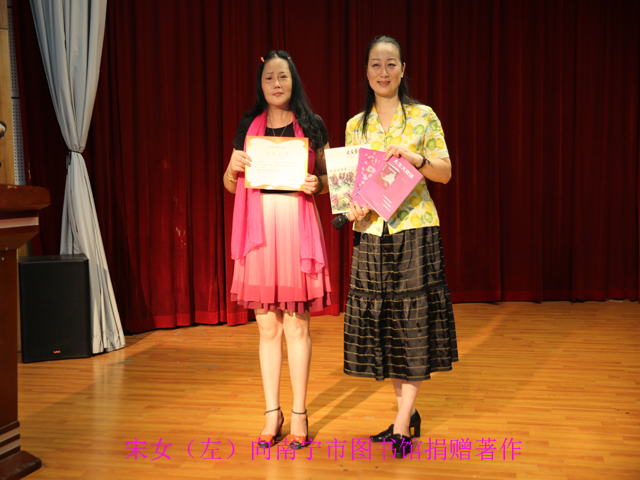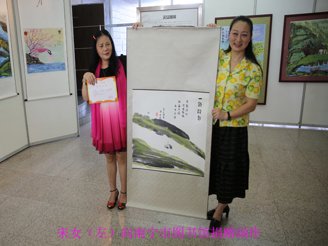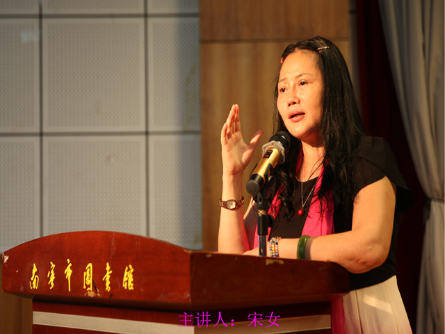 6月28日上午,南宁市图书馆汇聚了绿城众多文学家与艺术家以及读者朋友们,吸引这近300位嘉宾到场的是当天在这里举行的两场公益文化活动:“绿城展廊”——宋女个人画展开幕式与玫瑰作家铿锵绽放“绿城讲坛”第六季——“善待你的梦想,生命没有衰老期”文学讲座。这次活动由南宁文学院、南宁市作协、《红豆》杂志社和南宁市图书馆、“绿城玫瑰”女作家群联合举办。此次画展的主角亦即讲座的主讲宋女主张激情创作,宁静生活,她在活动中为南宁市图书馆赠送了她的精美画作和文学著作,这些作品将在南宁市图书馆第十届南宁人著作展中展出,并在地方文献阅览室永久收藏。