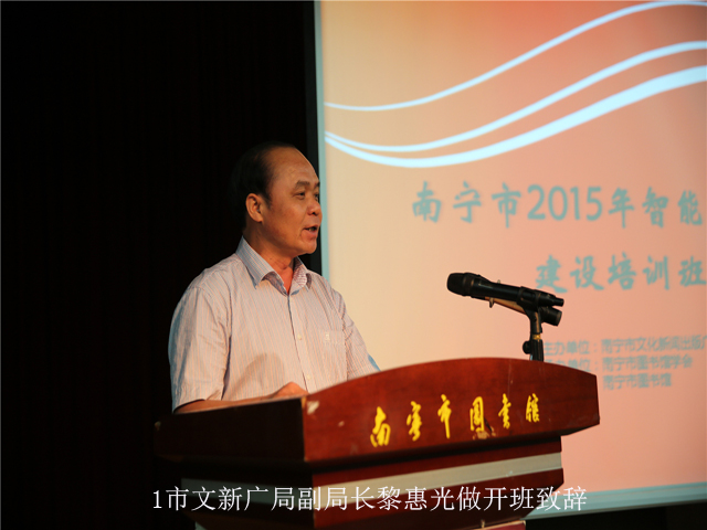 开班仪式上,市文新广局副局长黎惠光就本次培训的目的和意义作了讲话。他指出,随着现代信息技术的飞速发展,数字化、网络化和信息化正日益融入人们的生活,智能化建设对图书馆的业务提出了新的挑战,图书馆人要紧跟时代潮流,加快创新步伐,转变观念,开拓进取,携手合作,共同致力于智慧图书馆的建设,打造基于新媒体的图书馆服务新业态。他希望学员们在这次培训中能带着问题和目标认真学习,在今后工作中学以致用、用以促学,推动公共图书馆事业迈上新台阶。