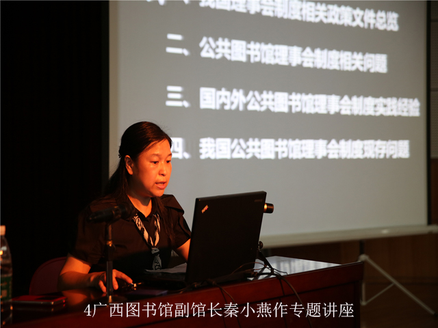培训过程由市图书馆副馆长蒋桂香主持。15日上午,首先由南宁市图书馆技术部主任王翔作“新时期图书馆发展的技术牵引”专题讲座。如何在新环境下利用新技术抓住新机遇不断推进图书馆的转型与发展?面对此问题,王主任从云计算、物联网、大数据分析、微信等新技术带给图书馆的变革作了实例分析;下午由广西壮族自治区图书馆副馆长秦小燕讲述“公共图书馆理事会制度的探索与实践”,介绍了法人治理结构理事会制度的相关政策,对比了正在进行试点的各个图书馆理事会的构成,为今后我市相关工作的开展提供了很好的借鉴。“公共图书馆理事会制度”在我国虽仍处于摸索和试点阶段,但对激发公共图书馆活力具有十分积极的作用。课后学员们踊跃提问,秦副馆长均作了全面细致的回答。