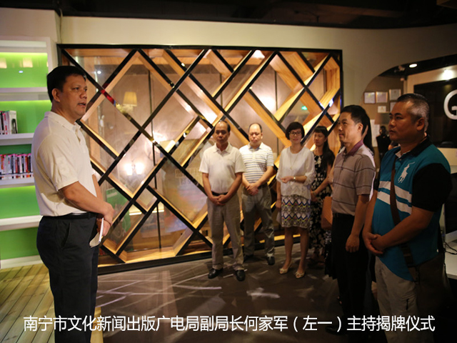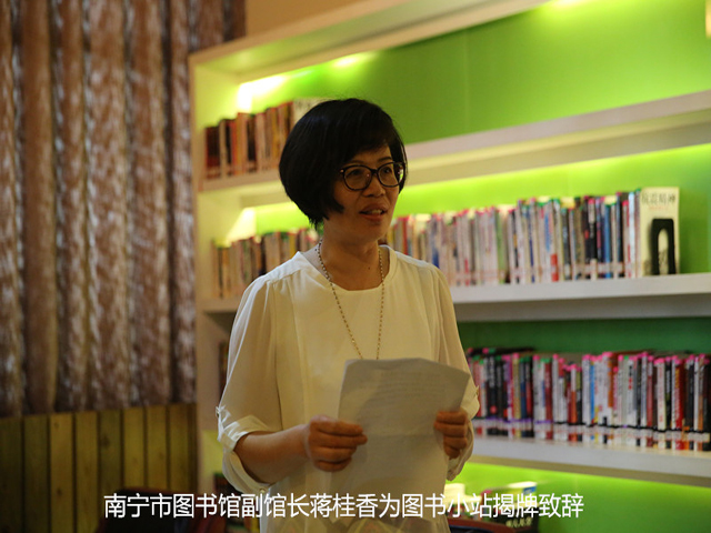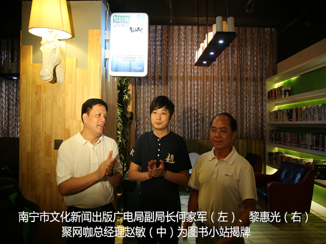 7月30日上午,南宁市首家“图书小站”在凤翔路“聚网咖”蓝山店揭牌。南宁市文化新闻出版广电局副局长何家军、副局长黎惠光、市场科科长潘家亮、公共文化科科长谢榭、南宁市图书馆副馆长陆庆、副馆长蒋桂香等领导出席了揭牌仪式。
