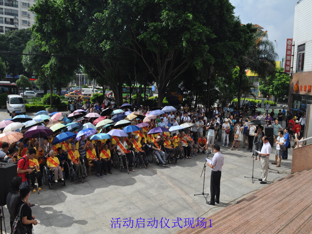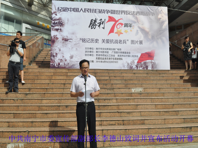 启动仪式上,中共南宁市委宣传部副部长李德山致词并宣布“铭记历史•关爱抗战老兵”大型图片展开幕。他首先向老兵同志们致以真诚的问候和崇高的敬意,并指出:从1931年到1945年,历时14年的中国人民抗日战争,尤其是1937年“七七事变”爆发后的全民抗战,是近代以来中国抗击外敌入侵的第一次完全胜利,并在世界面前树立了以弱胜强的光辉范例。在抗战期间,广西共征兵120多万人出桂杀敌,体现了广西人民对和平的共同坚守。值得欣慰的是,在广西民政、广西民革、广西壹方慈善基金会以及全区各地志愿者团队和社会各界爱心人士的共同努力下,已发现并确认健在的广西抗战老兵超过520名。每一个健在老兵,就是一部抗战史。今天,我们在这里举行“纪念中国人民抗日战争暨世界反法西斯战争胜利70周年——铭记历史•关爱抗战老兵”图片展及慰问活动,是为了牢记历史、不忘过去、珍爱和平、开创未来。最后,他号召同志们不忘先辈奋斗历史,不停后辈前进步伐,发扬中华民族英勇顽强、不屈不挠之英雄气概,向着民族复兴伟大目标不断迈进。