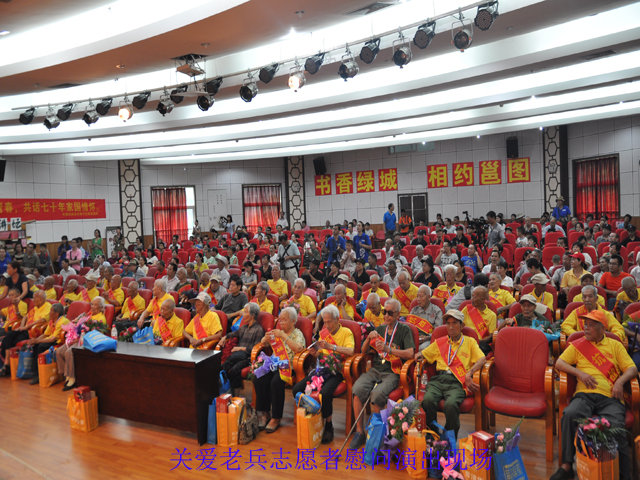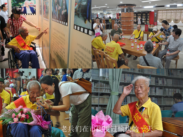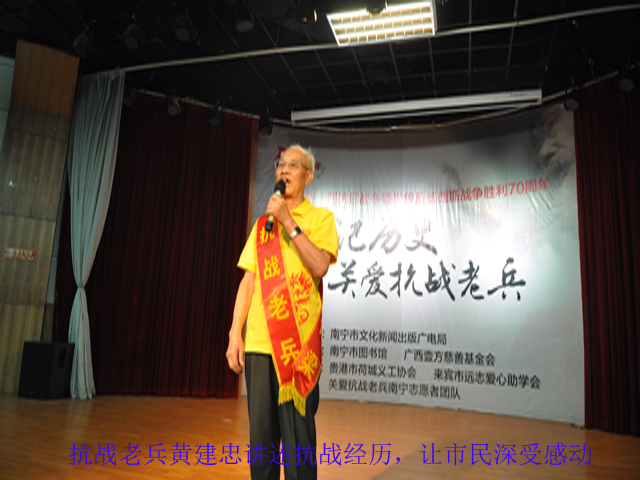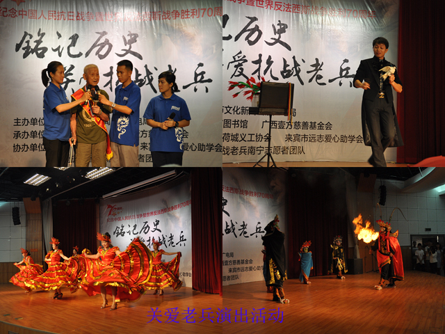 70年前,战士们用鲜血为国奋战;70年来,抗战老兵们一直牵动着华夏儿女的心。活动当天,南宁市图书馆还在多功能厅举办了“关爱老兵志愿者慰问演出”,以深情怀旧的合唱《同期的桂花》、中国传统艺术的《变脸》等精彩表演,向抗战老兵们表达深情敬意,让老兵和现场观众都大饱眼福。在慰问演出现场,抗战老兵黄建忠代表发言,讲述了抗日战争的亲身经历,让市民第一次与抗战英雄零距离接触,深受感动;由已逝老兵与现场老兵隔空同唱的高亢激昂的《胜利之歌》将演出活动推向了高潮,不少老兵唱着唱着眼角泛起了晶莹的泪花;志愿者们还为抗战老兵送上社会各界爱心人士赠送的祝福之花,演出活动在全体起立、向老兵庄严敬礼表达感谢的仪式中结束。
