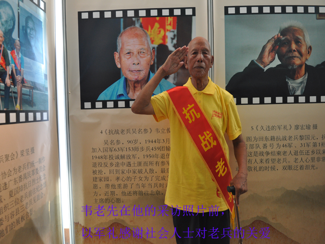 70年岁月无情,唯有记忆永恒。《搀扶》、《久违的军礼》、《机枪手的眼》、《我们都是一家人》……镜头里的每一位老兵影像都是一段悲壮的历史,述说着当年的峥嵘岁月,敲打着每一位观众的心房。在抗战胜利70周年后的今天,“铭记历史•关爱抗战老兵”图片展正是让人们怀着一颗感恩的心,在一张张坚毅的面孔下,在一幅幅温情的画面里,放下仇恨,一同来关爱抗战老兵,铭记这些曾经被我们遗忘的面孔,铭记他们的付出,铭记历史,同时向在抗日战争中英勇战斗、为国捐躯的烈士表示深切的怀念。