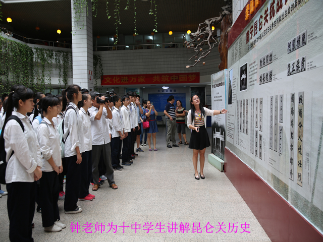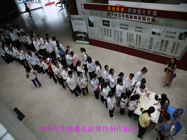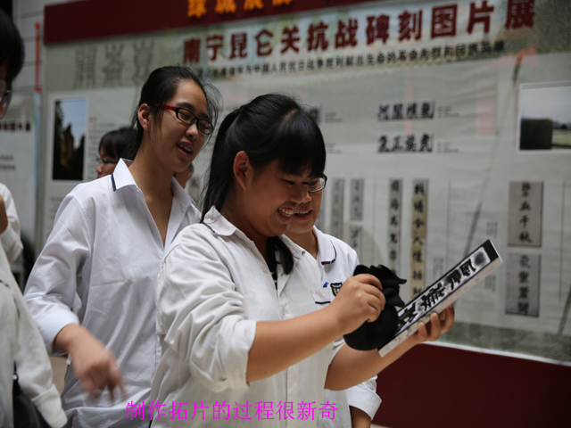 近日,不少市民或自发或组织,纷纷走进南宁市图书馆艺术展廊观看了南宁昆仑关抗战碑刻图片展。广西出入境检验检疫局在组织观展后表示,这些真实生动的碑刻文字是对历史的一种回顾,更是对英雄的不屈记忆;南宁十中的百余名师生在聆听了讲解后,积极投入到碑刻拓印活动当中,孩子们说,这次活动不虚此行,在了解昆仑关历史、致敬抗战英雄的同时,还能将自己亲手拓印的“昆仑关”碑刻带回珍藏,真是好有价值啊!