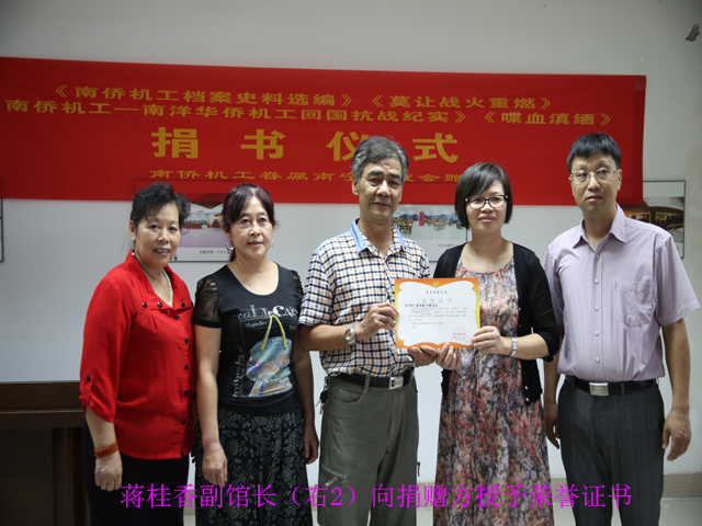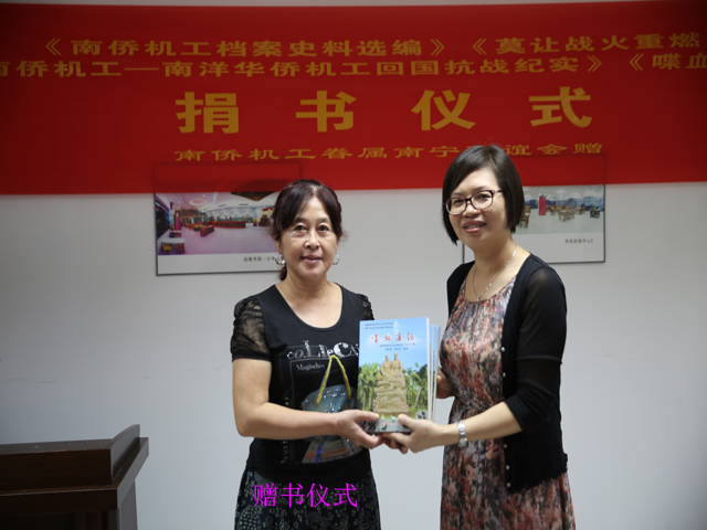 2015年9月29日,南宁市侨联直属团体会员南侨机工眷属南宁联谊会在南宁市图书馆举行“《南侨机工档案史料选编》《莫让战火重燃》《南侨机工—南洋华侨机工回国抗战纪实》《喋血滇缅》”捐书仪式。南宁市图书馆蒋桂香副馆长、读者活动部全维明主任、黄珂副主任、期刊部叶卫副主任及南宁市侨联副主席侯嘉康、副调研员殷红,南侨机工眷属南宁联谊会会长温瑞雄、副会长冯建群等相关人员出席了捐书仪式。