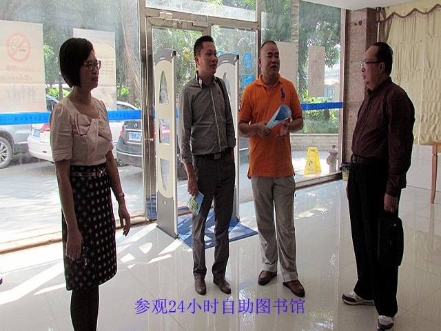 10月15日上午10时,宾阳县图书馆馆长黄中武、党支部书记白道培等一行5人到我馆参观学习。首先参观的是位于我馆一楼的24小时自助图书馆,考察团认真听取了我馆陆庆副馆长关于24小时自助图书馆建设的经验介绍,并就24小时自助图书馆内的自助借还书机、移动还书箱、RFID安全门、24小时门禁联动报警系统、监控系统和无线网络的配置,以及室内装修风格和书架与阅览桌椅的摆放等问题进行了交流。