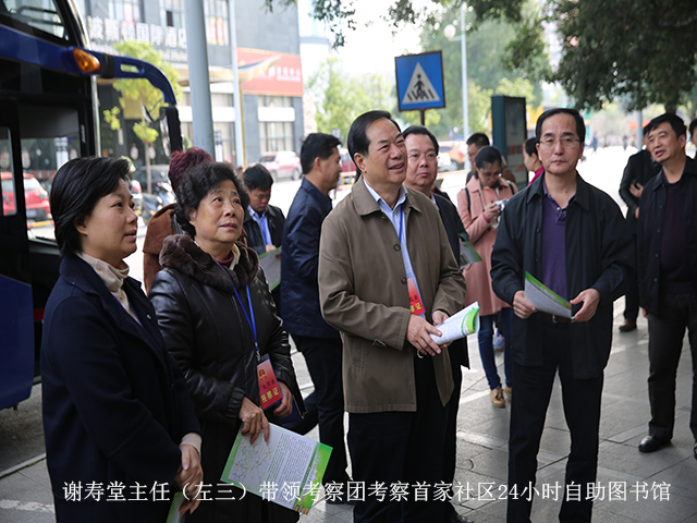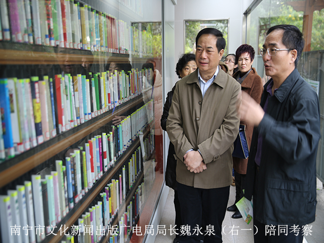 壮乡大地暖阳融融,绿城南宁书香阵阵。2015年12月17日上午,由全国、自治区、市人大等百名代表组成的考察团,在南宁市第十三届人民代表大会常务委员会主任谢寿堂的带领下,到友爱广场实地考察我市首家社区24小时自助图书馆的建设情况,市文化新闻出版广电局局长魏永泉、副局长黎惠光陪同。