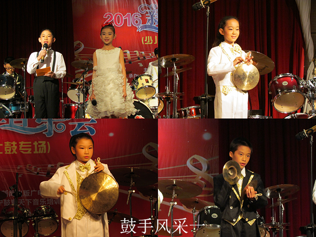 这场音乐盛宴以“尽情挥舞手中的鼓棒•潇洒秀出自我的风采”为活动主题,小鼓手们在现场淋漓酣畅的表演带动了全场观众如痴如醉,情绪随鼓点曲调起伏跌宕,共同进入打击音乐的美妙境界。本场演奏会中有不少小鼓手已获得十级证书,并先后在全区、全国的大赛中获取荣誉。在铿锵热闹的开场曲《Let It Go》之后,小鼓手们先后为观众们演奏了《真的爱你》、《棉花眼睛》、《拉德斯基进行曲》等经典作品,现场观众无不为小鼓手们娴熟欢快的节奏所感染,不禁跟随鼓点打着节拍融入这迎新年的喜庆气氛当中。民族打击乐与爵士鼓演奏《粉墨人生》是当晚最大的亮点,这首曲子是中国老牌流行乐队“零点乐队”的作品之一,零点乐队在这首摇滚风格的《粉墨人生》中融入了国粹京剧音乐的元素,把西方摇滚乐与民族音乐巧妙的结合在一起,给人耳目一新的感觉,而在此次演奏过程中,南宁鼓童天下音乐培训中心的刘干平老师更是在这首原本只有爵士鼓演奏的《粉墨人生》中加入了京剧打击乐,并首次尝试让小鼓手们使用大锣、小锣和钹进行现场演奏,从而完成一次民族打击乐与西洋打击乐(爵士鼓)的对话,此曲的表现形式在广西尚属独创亦是首例,可谓合璧之美;在《彩虹的微笑》曲目中,台上亮丽惊艳的女子组合将爵士鼓演奏得潇洒自如,她们脸上绽放的笑容恰如彩虹般绚丽迷人;梁睿喆表演的打唱《山歌好比春江水》和卢钰演奏的《My Life Would Suck Without You》同样引起场上不小的撼动;中外“神曲”串烧《江南Style》《忐忑》《小苹果》《最炫民族风》那紧凑连贯的演奏更使全场沸腾起来;独奏《Give Me Novacaine》《Sno-Nuff》,二重奏《克罗地亚狂想曲》,合奏《逆战》《西班牙斗牛曲》《名侦探柯南》《我的中国心》《Victory》《威廉退尔序曲》轮番奏响,特色各异的表演风情彰显着的是小鼓手们相同的激情热力。当演奏会接近尾声之时高潮再起,刘干平老师与小鼓手们共同登台,在台上倾情互动,合作完成一曲《卡拉永远OK》,令现场掌声与欢呼此起彼伏。