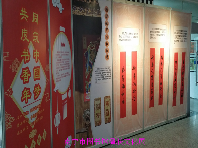 本次“同筑中国梦•共度书香年”楹联文化展由国家图书馆主办,中国图书馆学会协办,南宁市图书馆承办。楹联展旨在传承民族楹联文化,丰富市民春节文化生活。楹联展共分楹联概述、楹联的分类、楹联的形式以及楹联的创作这四个单元,以赏析传统佳联与展示反映当代小康生活创作联为主,介绍楹联起源、特点、和文化内涵等内容。
